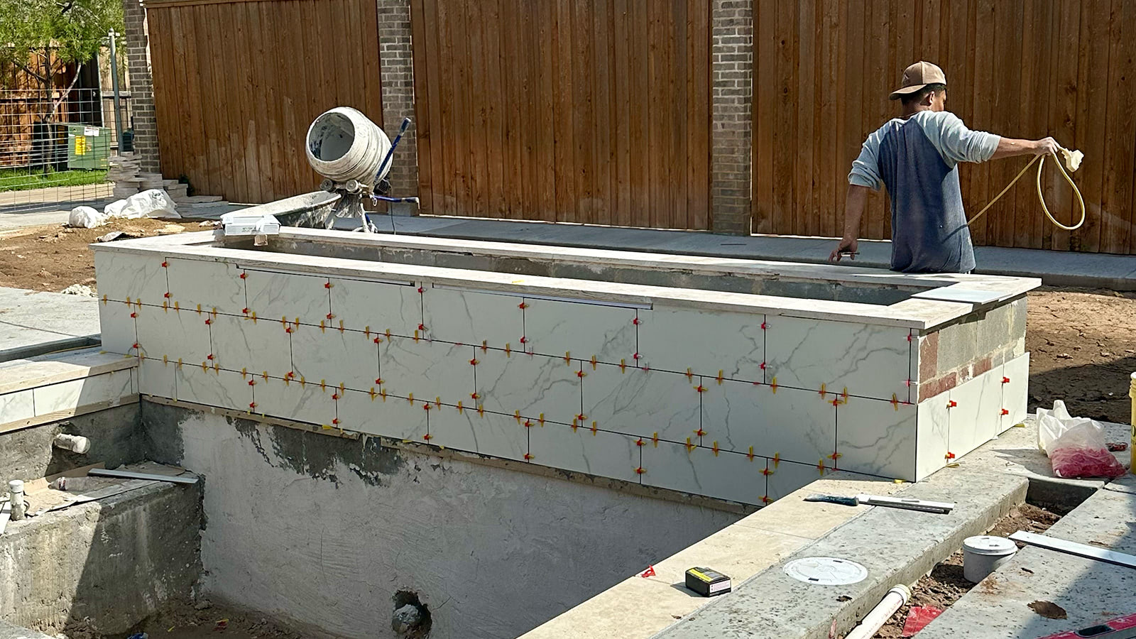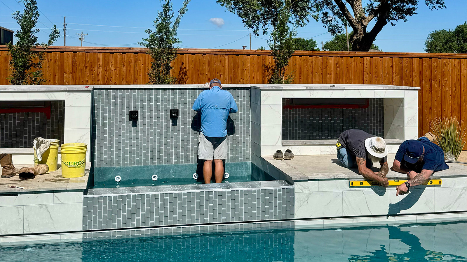 A 6″ band of frostproof tile is now applied to the top inside edge of your pool. This allows easy cleaning at the water line. If tile markers are to be placed on the stairs, they will be done day of plaster. Make sure water and electricity are available for the crew’s use.